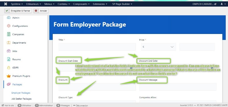 Je suis bloqué dans mon avancée. Je n'arrive vraiment pas à comprendre le sens des ces mots ? A quoi sert de remplir les champs avec ces mots ? s'il vous plait quelqu'un peut il m'expliquer le sens et l'utilisation de ces mots et des champs qui contiennent ces mots ? le mot Discount et le mot Unforce unpublishil y aura certainement beaucoup d'autres que je ne comprendrais pas, ce composant est très mal traduit en Français, voir incompréhensible, mais pour l'instant si déjà j'arrive à comprendre ce 2 mots ça sera bien.Vous pouvez m'expliquer le sens et l'utilisation, l'utilité de ces 2 mots en Français si vous êtes Francophone ou en Anglais si vous êtes Anglophone. Merci d'avanceJe vous joint 2 captures écran.
